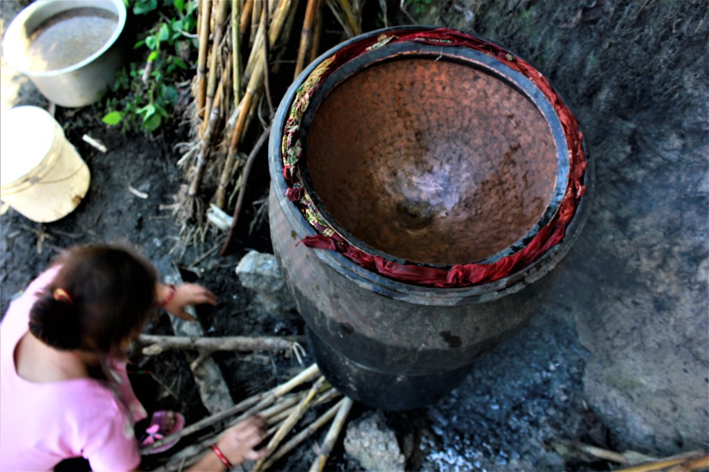 La primera vez que probé el raksi fue en casa de Hari, nuestro anfitrión en Lamagaon. Ese día Hari había invitado a sus vecinos a cenar y a tomar raksi a su casa, después de que estos le ayudaran a cortar el arroz de sus campos. Así lo manda la tradición.