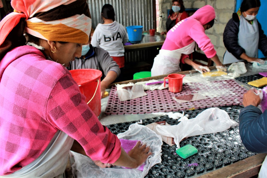 Estamos en Epsa Nepal, una organización sin ánimo de lucro fundada en 2009 que da trabajo a mujeres discapacitadas de las zonas rurales de Nepal. En una pequeña construcción de chapa cuatro trabajadoras reciben las instrucciones de un profesor que les explica cómo hacer muñecos de fieltro. Ahora están haciendo un león. En el patio, unas diez mujeres se sientan alrededor de varias mesas y lavan el fieltro con agua y jabón. Unas hacen perfectas bolas con una plancha de madera de forma circular que más tarde servirán para hacer tapetes de colores, y otras dan forma de rectángulo al fieltro que, con mucho esmero y con ayuda del jabón, acabará siendo un billetero sin necesidad de costuras.